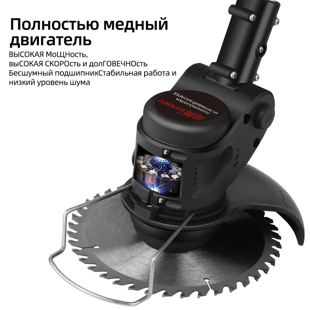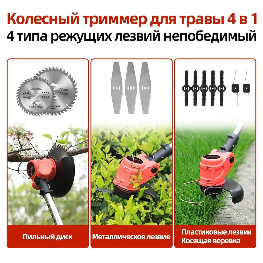 Аккумуляторный садовый триммер – ваш идеальный выбор для стрижки газона, удаления сорняков и резки кустарников. Этот триммер с четыре типами лезвий (диск для газонов, Косящая веревка, металлические и пластиковые лезвия для сорняков) обеспечивает профессиональный уход за вашим садом.